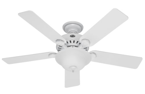 The Five Minute Fan brings instantaneous comfort in five minutes or less, with the same quality and craftsmanship Hunter customers have trusted for generations. How can we be so sure? Because the Five Minute Fan comes 90-Percent pre-assembled right out of the box-so the most difficult task is choosing which style goes best with your dcor. Classic with a contemporary twist, the easy style of the white finish blends seamlessly with your decor. Reversible White/Beech blades let you customize your blade finish to furniture or wood molding. Easy Lock blades slide and lock into place for quick assembly, no screws required. The simple swirled marble glass bowl fixture uses one 26 watt CFL (compact fluorescent) bulb with up to a 10,000 hour lifespan. Pro's Best has earned the Energy Star label identifying highly efficient products with superior energy performance. Can be installed without light kit if desired. Designed for large areas, Hunter's 49-Inch to 60-Inch ceiling fans have airflow efficiencies ranging from approximately 51 to 176 cubic feet per minute per watt at high speed. Using your Hunter fan properly throughout the year can help to significantly decrease personal energy use without sacrificing comfort. A properly used fan can help to reduce summer cooling costs by up to 47-Percent* CFL Bulb not included. Limited lifetime warranty on fan motor only. 1 year limited warranty on other parts, excluding glass globes or light bulbs. *(On average at low speed setting. Savings may differ depending upon geographic location, housing charactersitics and cost of energy.)