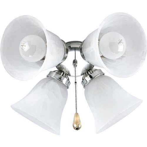 Progress Lighting P2610-09 Four-light kit with white washed alabaster style glass. For use with P2500 and P2501 ceiling fans. Quick connector for easy wiring. Spring clip glass attachment. Brushed Nickel Fixture is Shipped with 13w Compact Fluorescent screw-in lamp. AirPro Brushed Nickel 4-light Ceiling Fan Light Ceiling fan light fixture features alabaster style glass shades with innovative spring clip glass attachment system which eliminate unsightly excess hardware. For use with the following Progress Lighting fans: P2500, P2501, P2502 (indoors only), P2524 and P2525. Brushed Nickel finish Alabaster glass 15 In. Diameter x 6-1/4 In. Height Uses (4) 60-watt medium base bulbs - Includes 13-watt, non-dimmable CFL (Includes 13-watt compact fluorescent bulbs in compliance with EPACT) Fan sold separately