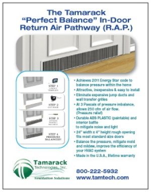 Have you ever experienced hot and cold spots within the home, or a general lack of ventilation between rooms? The Tamarack Door-Rap is the solution. Attractive/Inexpensive option for solving indoor pressure imbalances caused by the HVAC system. At 3 Pascals achieves 250 cfm of air flow. (pressure relief). Durable ABS plastic (paintable) and interior baffle to mitigate noise and light. Comes in White. 24" width X 4" height rough opening, fits most standard size doors. Balance the pressure, mitigate mold and mildew, and make your HVAC system perform! Lifetime Warranty ! You break it, we replace it. In-Door Return Air Pathway (R.A.P.) The R.A.P. is the inexpensive alternative to costly jump ducts or dedicated room fresh air returns. In-Door Return Air Pathway (R.A.P.)? Eliminates pressure imbalances ? Meets Energy Star and R2000 standards ? Allows HVAC systems to run more efficiently ? Inexpensive, easy to install, no moving parts ? Internal noise and light diminishing baffle ? Durable, high impact ABS plastic ? Made in the USA ? Lifetime guarantee
